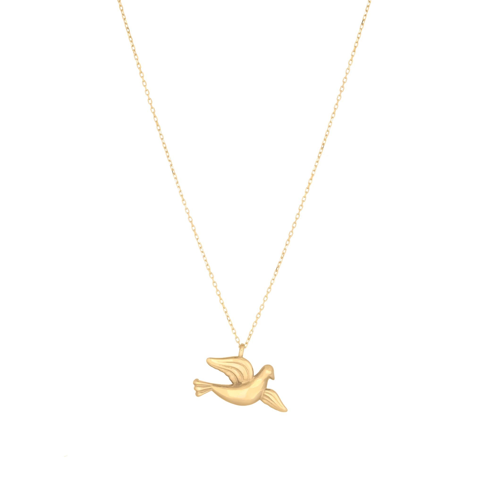 Özel günlerinize ışıltı katan bu 14 ayar altın kolye, güvercin motifi ile tasarlanmıştır. Her anınıza eşlik edecek zarif tasarımı sayesinde, hem günlük hem de özel davetlerde şıklığınızı tamamlayacak. Evlilik teklifi, doğum günü ya da yıldönümü gibi anlamlı anlar için mükemmel bir hediye seçeneği sunar.