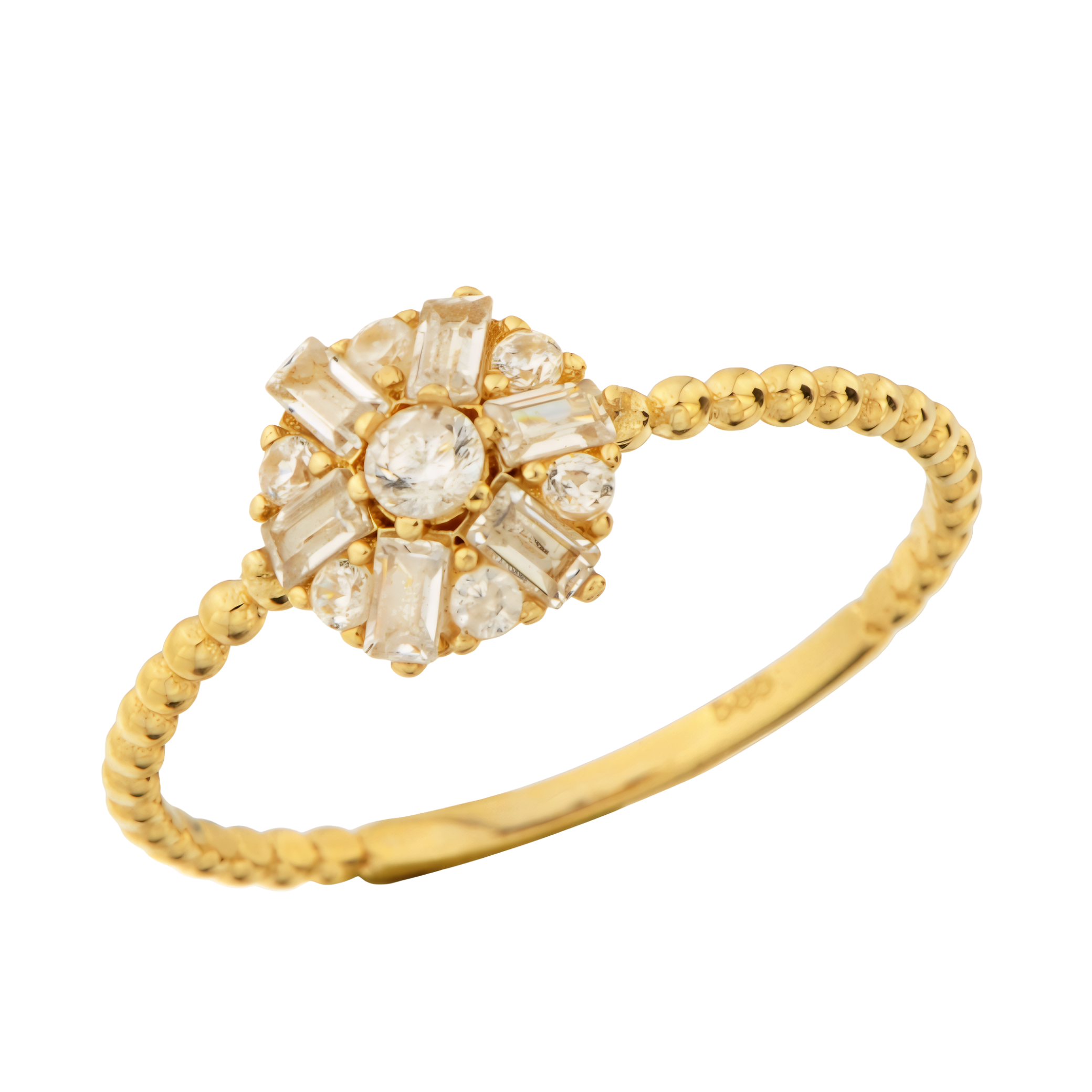 1,22 gram ağırlığında, 14 ayar altın kullanılarak tasarlanmış bu şık altın yüzük, papatya model taşları ile süslenmiştir. Özel günlerinize ışıltı katarak, her anınıza eşlik edecek zarif bir tasarıma sahiptir. Evlilik yüzüğü olarak da tercih edebileceğiniz bu ürün, hayat boyu saklanacak değerli bir armağan niteliğindedir.